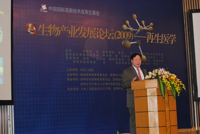 ??? 2009年11月17日,韓忠朝教授作為特邀嘉賓參加中國工程院在深圳第十一屆高交會(huì)上舉辦的主題為“再生醫(yī)學(xué)”的“生物產(chǎn)業(yè)發(fā)展論壇(2009)”。本次論壇由中國工程院醫(yī)藥衛(wèi)生學(xué)部主任楊勝利院士主持,中國工程院醫(yī)藥衛(wèi)生學(xué)部王正國院士擔(dān)任論壇執(zhí)行主席。中國工程院副院長鄔賀銓院士、深圳市副市長唐杰、國家發(fā)展和改革委員會(huì)高技術(shù)產(chǎn)業(yè)司巡視員綦成元出席并致辭。