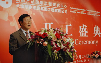 ??? 2010年9月24日上午,細胞產(chǎn)品國家工程研究中心研發(fā)大樓奠基式在天津濱海新區(qū)隆重舉行。會議由天津昂賽細胞基因工程有限公司副總經(jīng)理主持,細胞產(chǎn)品國家工程研究中心主任韓忠朝教授致詞,天津市科委副主任陳養(yǎng)發(fā)及濱海新區(qū)科委主任黃亞樓都在奠基儀式發(fā)表講話。