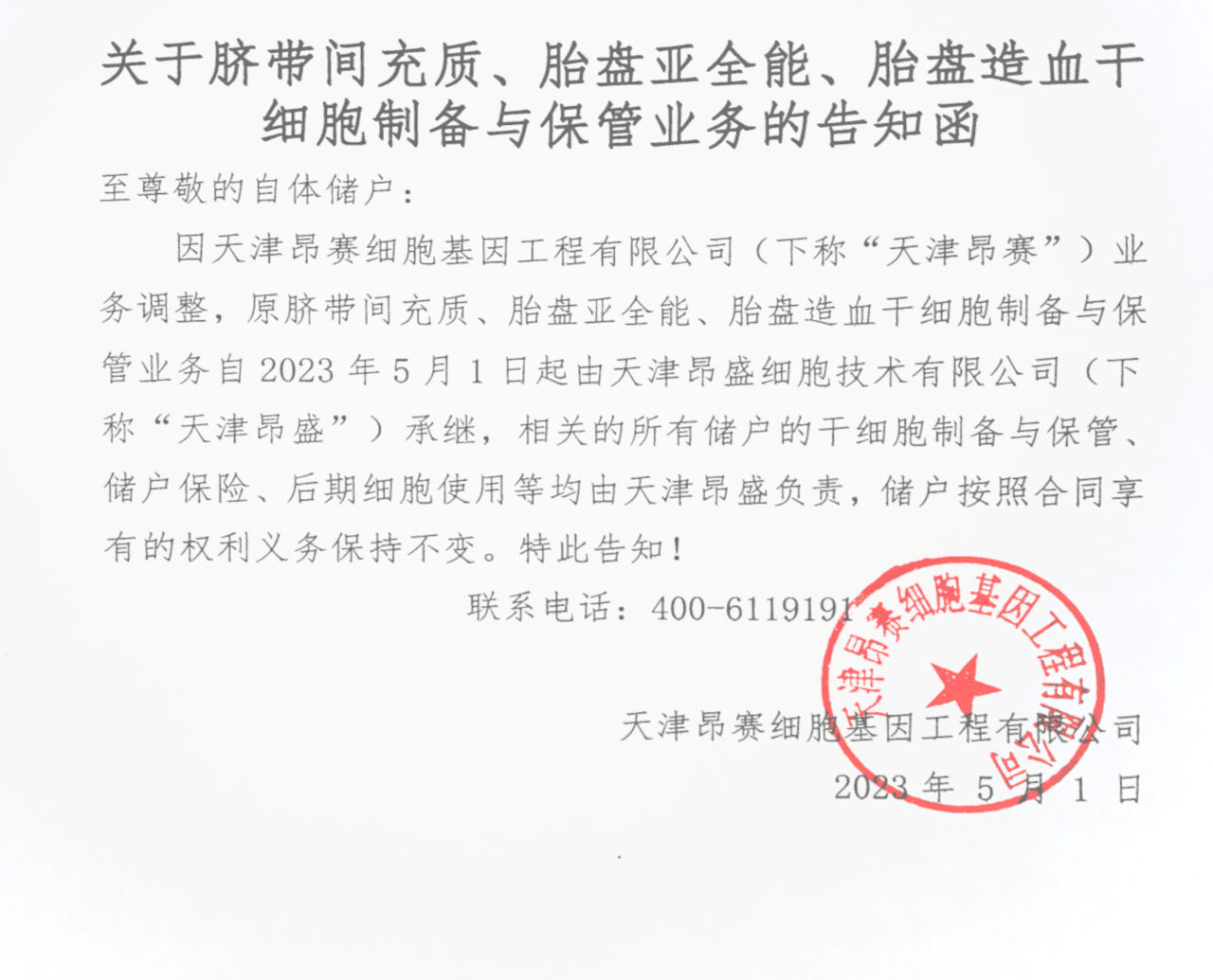至尊敬的自體儲(chǔ)戶: 因天津昂賽細(xì)胞基因工程有限公司(下稱“天津昂賽”)業(yè)務(wù)調(diào)整,原臍帶間充質(zhì)、胎盤亞全能、胎盤造血干細(xì)胞制備與保管業(yè)務(wù)自2023年5月1日起由天津昂盛細(xì)胞技術(shù)有限公司