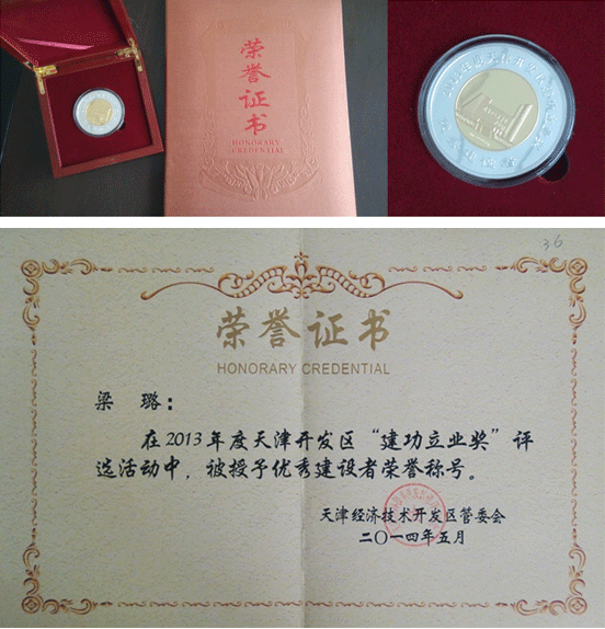 ? ? ? ? 2014年5月9日,天津開(kāi)發(fā)區(qū)2013年度“百?gòu)?qiáng)企業(yè)”、“成長(zhǎng)最快企業(yè)”、“科技創(chuàng)新單位”、“科技小巨人”、“社會(huì)責(zé)任貢獻(xiàn)獎(jiǎng)”、“建功立業(yè)獎(jiǎng)”等獎(jiǎng)項(xiàng)頒獎(jiǎng)大會(huì)在投資服務(wù)中心舉行。會(huì)上,我公司技術(shù)開(kāi)發(fā)部副經(jīng)理梁璐博士被授予優(yōu)秀建設(shè)者榮譽(yù)稱號(hào)。